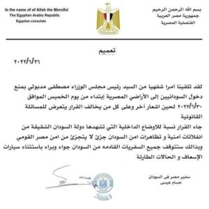 وإذ إننا ننفى بشكل قاطع وجود أى توجيهات بعدم دخول الأشقاء السودانيين لبلدهم مصر والتى ذكرها المولى عز وجل فى كتابه الكريم “أدخلوا مصر إن شاء الله أمنين”، فأننا ننتهز هذه السانحة للتأكيد على أن العلاقات المصرية/ السودانية أكبر من تلك الأقلام المأجورة والتى نرد عليها بكل الحب والود بحبابكم عشرة الأشقاء السودانيين فى بلدكم مصر.