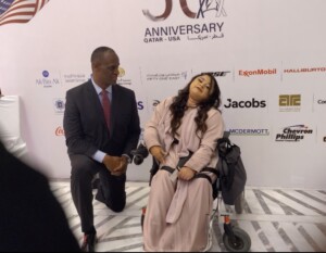 وقف السفير الأمريكي الجديد تيمي ديفيس وهو من أصول افريقية في مكان بارز في بهو القاعة وهو يستقبل ضيوفه ممن يريد ان يلقي عليه التحية ورأيته جالس على احدى ركبتيه ليتحدث مع شابة قطرية من ذوي الاحتياجات الخاصة وهي جلسة علي كرسي متحرك فحدثها مطولا ( نحو 5 دقائق ) وتمثل هذه الانحناءة قمة التواضع والاريحية